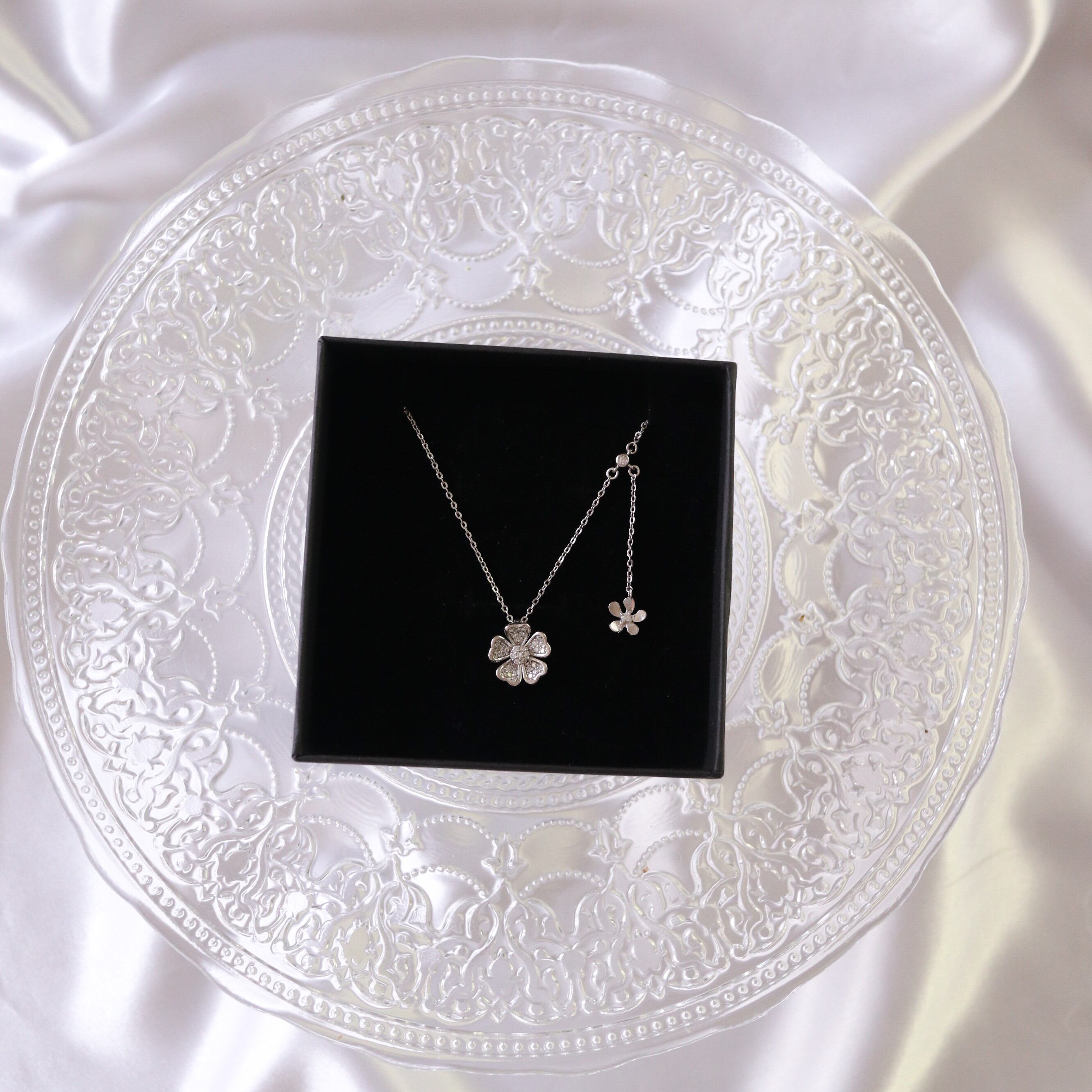 このネックレスは、大小2つのお花のモチーフを取り入れた華やかなデザインが魅力です。可憐さとエレガンスが同居するスタイルが特徴で、身につけることで特別な日の装いが一層引き立ちます。高品質な素材を使用しているため、その輝きは長く楽しむことができ、素晴らしい思い出をしっかりと刻んでくれます。
