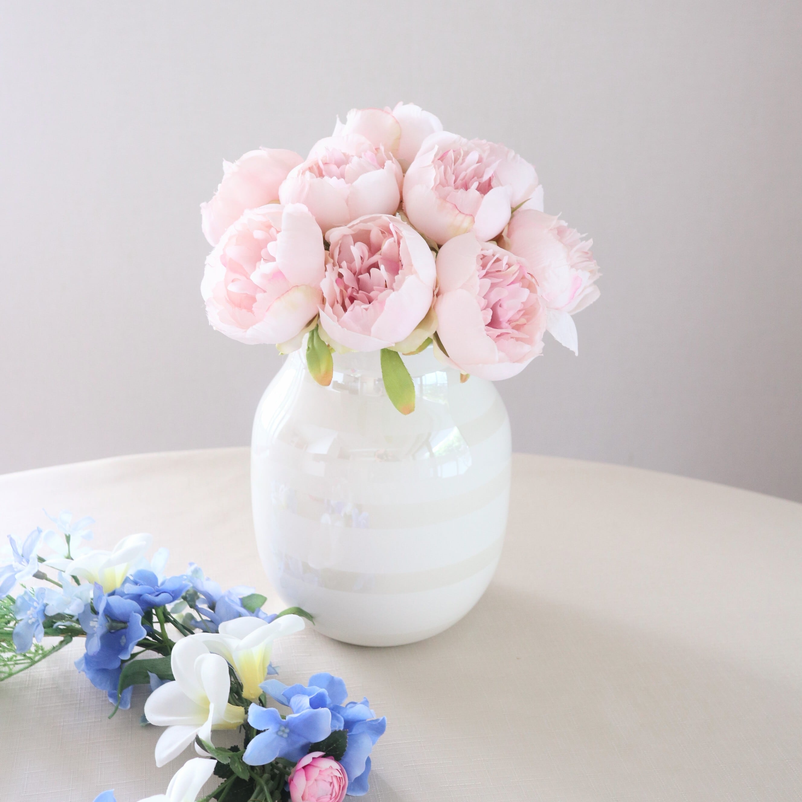 また、可愛いオールピオニーのブーケはシンプルでありながら存在感があり、どんな空間にも調和します。アーティフィシャルフラワー(高品質造花)を使用しているため、お手入れが簡単で、長期間その美しさを楽しむことができます。