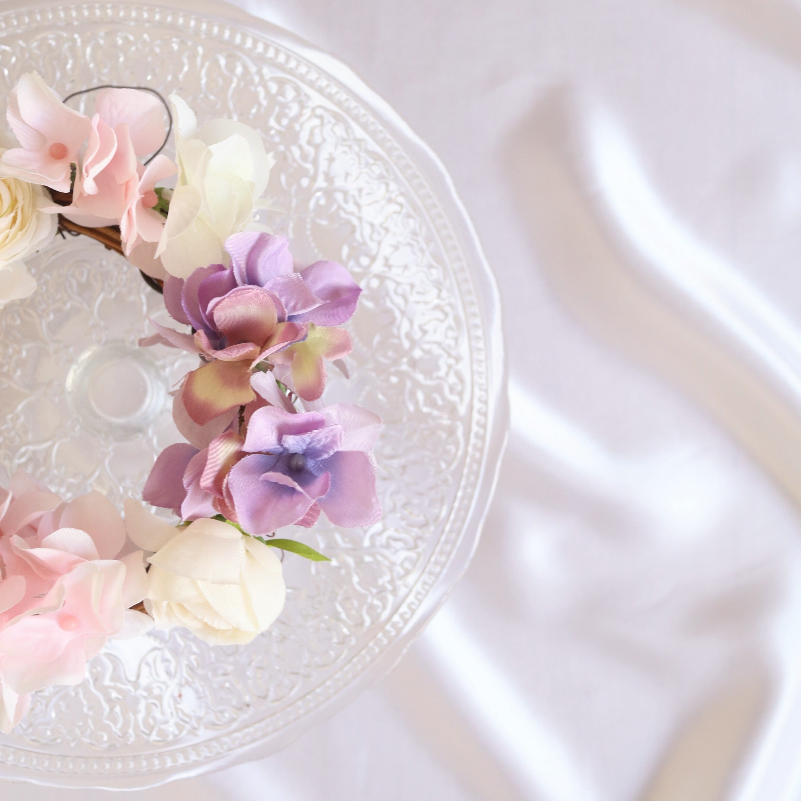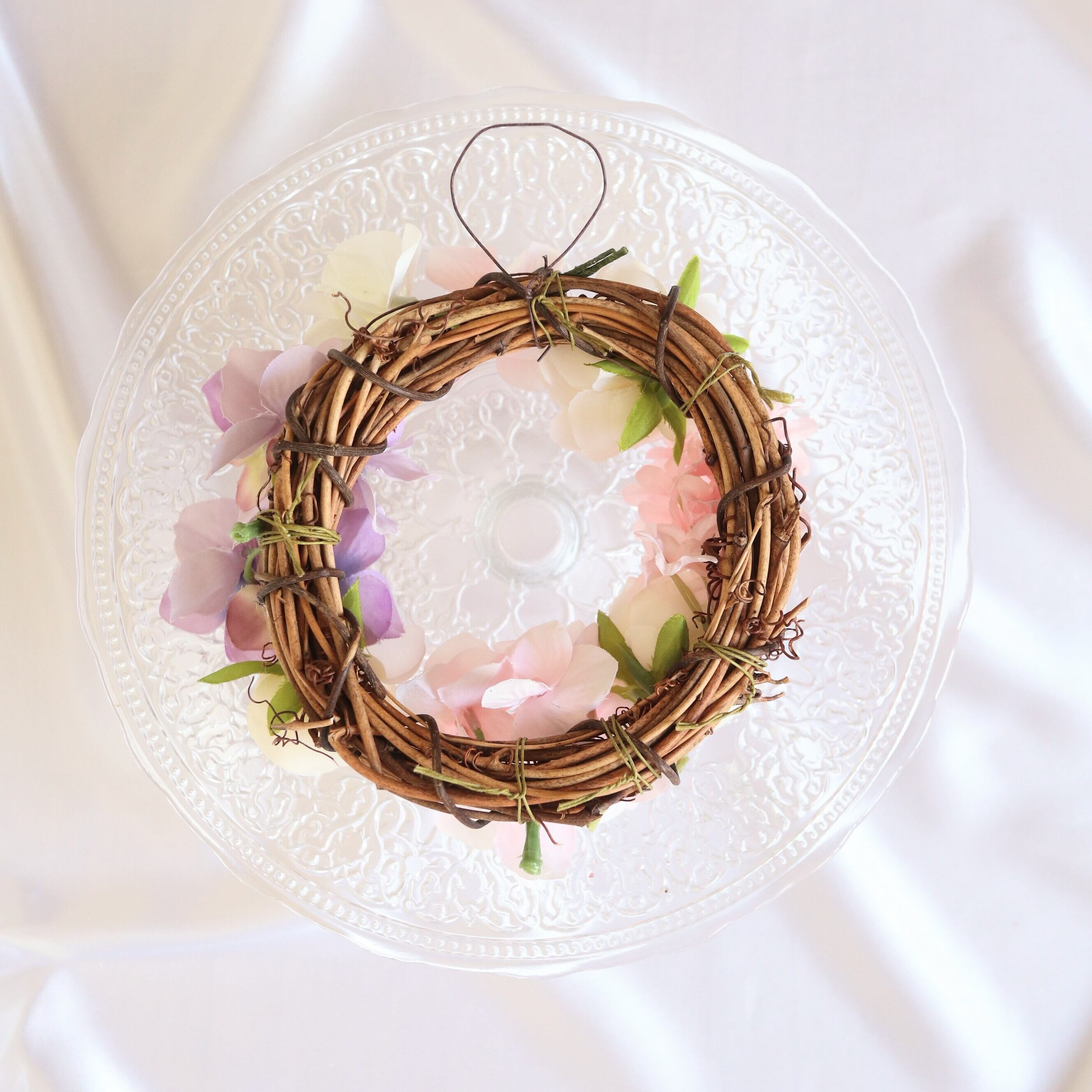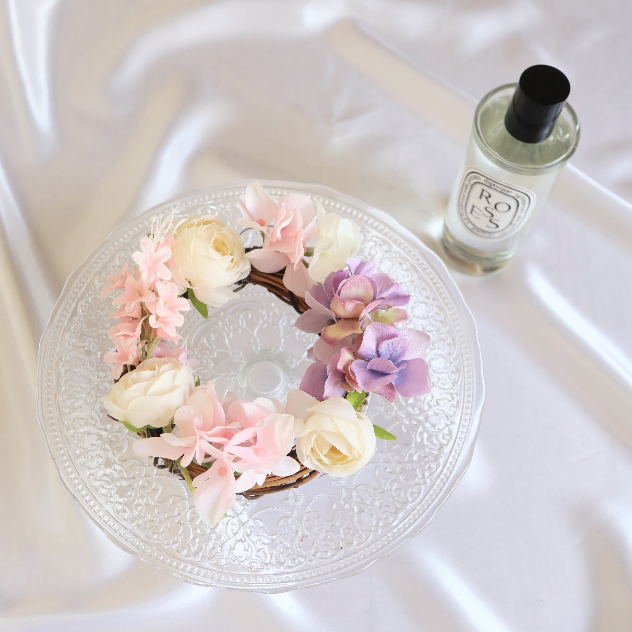 可愛いパステルカラーの紫陽花とローズ、ライラックを用いたコンパクトなリースは、心和むデザインが魅力のアイテムです。ピンク、ホワイト、ラベンダーなどやさしい色合いの花々が、お部屋や玄関を優しく彩ります。季節を問わず楽しめるデザインで、特別な空間を演出し、日常のインテリアにもぴったりです。