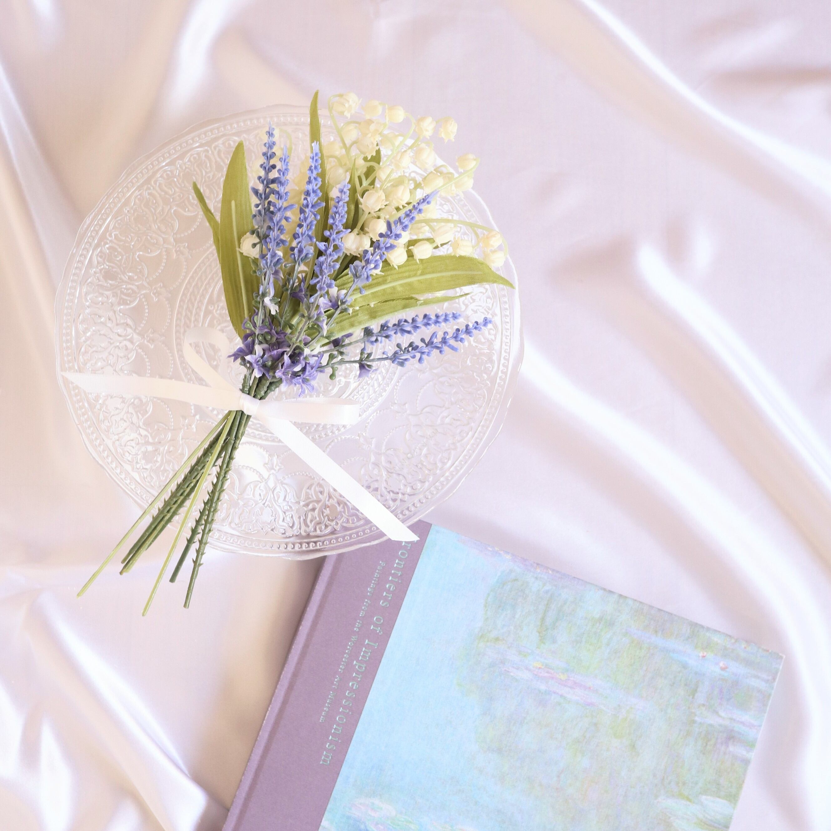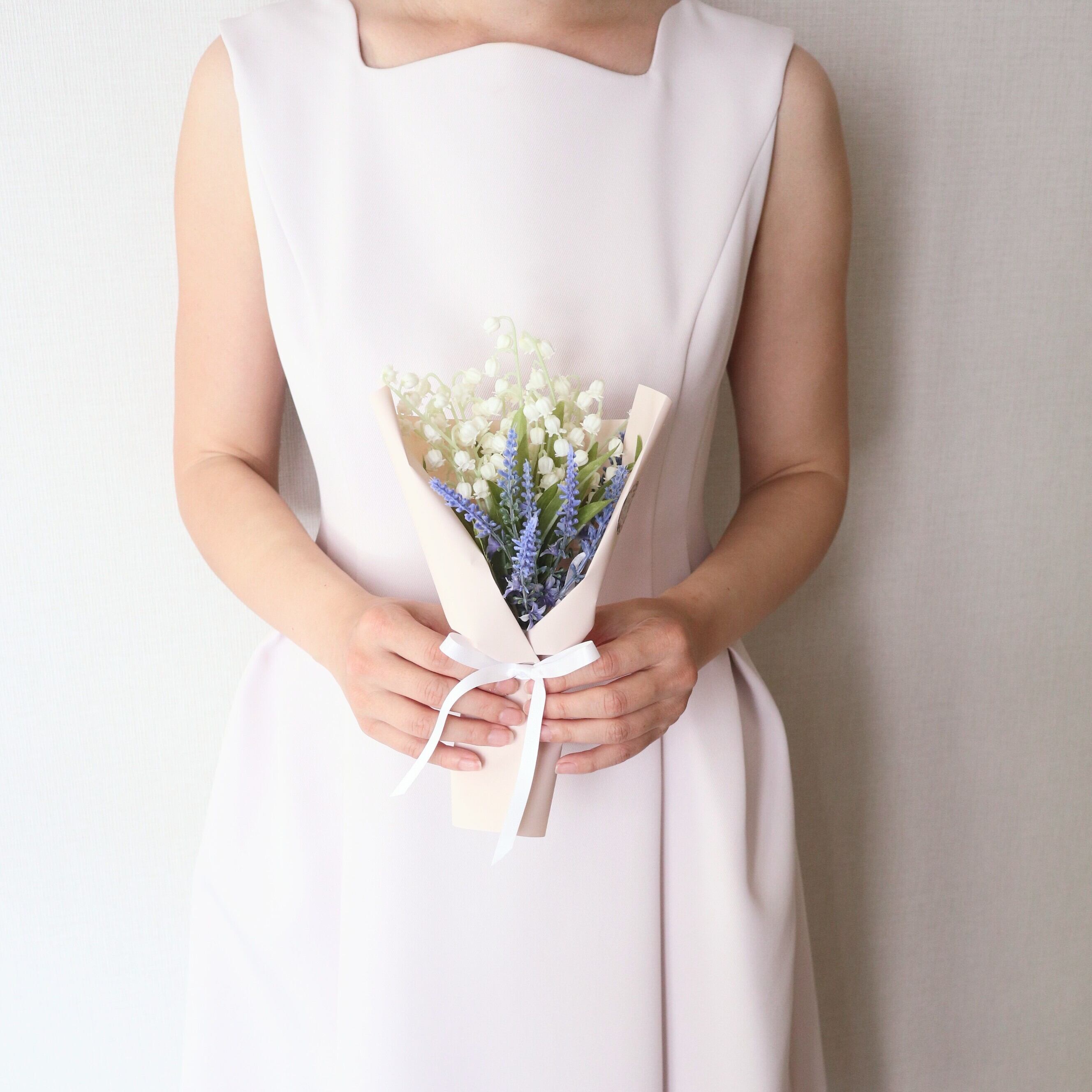 爽やかなホワイト&ブルーカラーのスズランとラベンダーを用いたミニブーケは、コンパクトながらも印象的なデザインが魅力のアイテムです。清々しいスズランと優雅なラベンダーの花々が、お部屋や玄関を涼しげに彩り、心安らぐ空間を演出します。このブーケは、特別な瞬間をより一層引き立て、日常のインテリアにもぴったりです。
